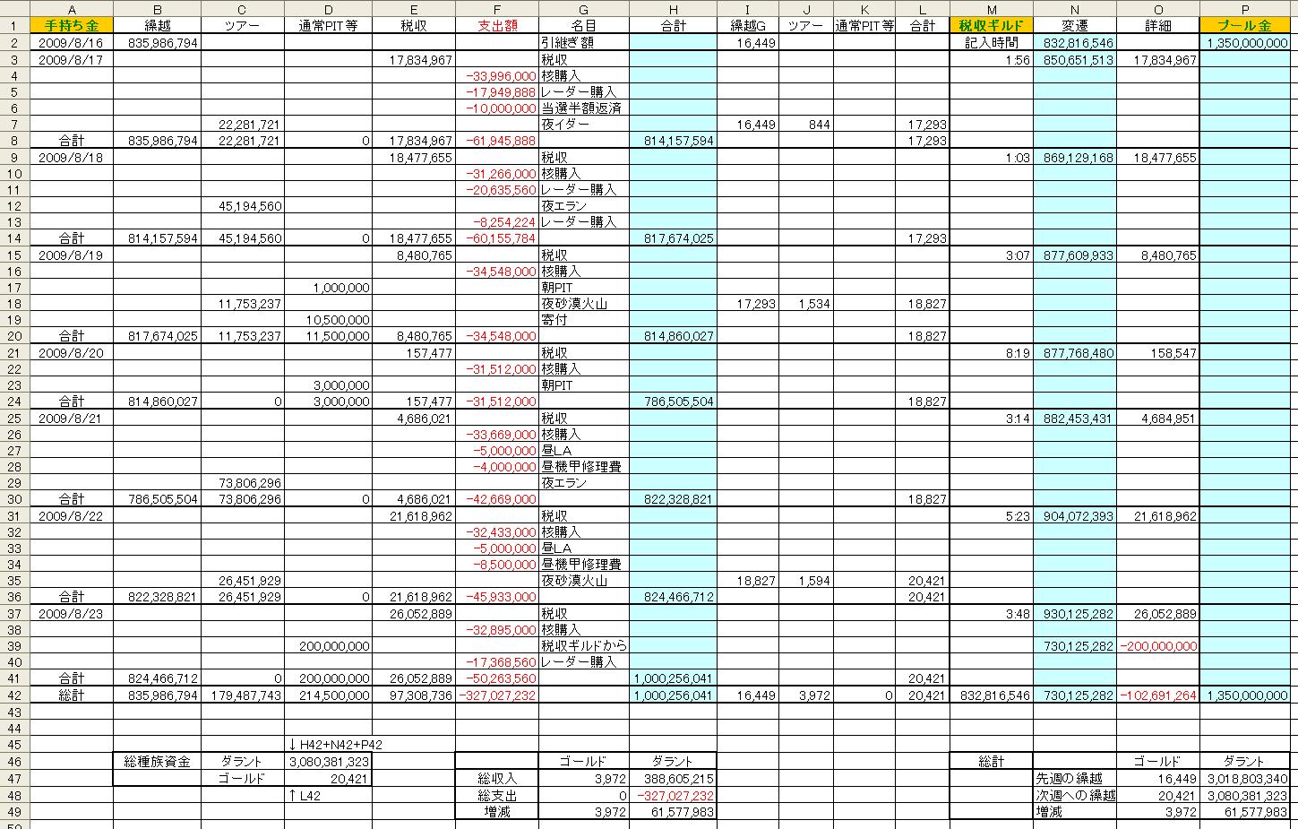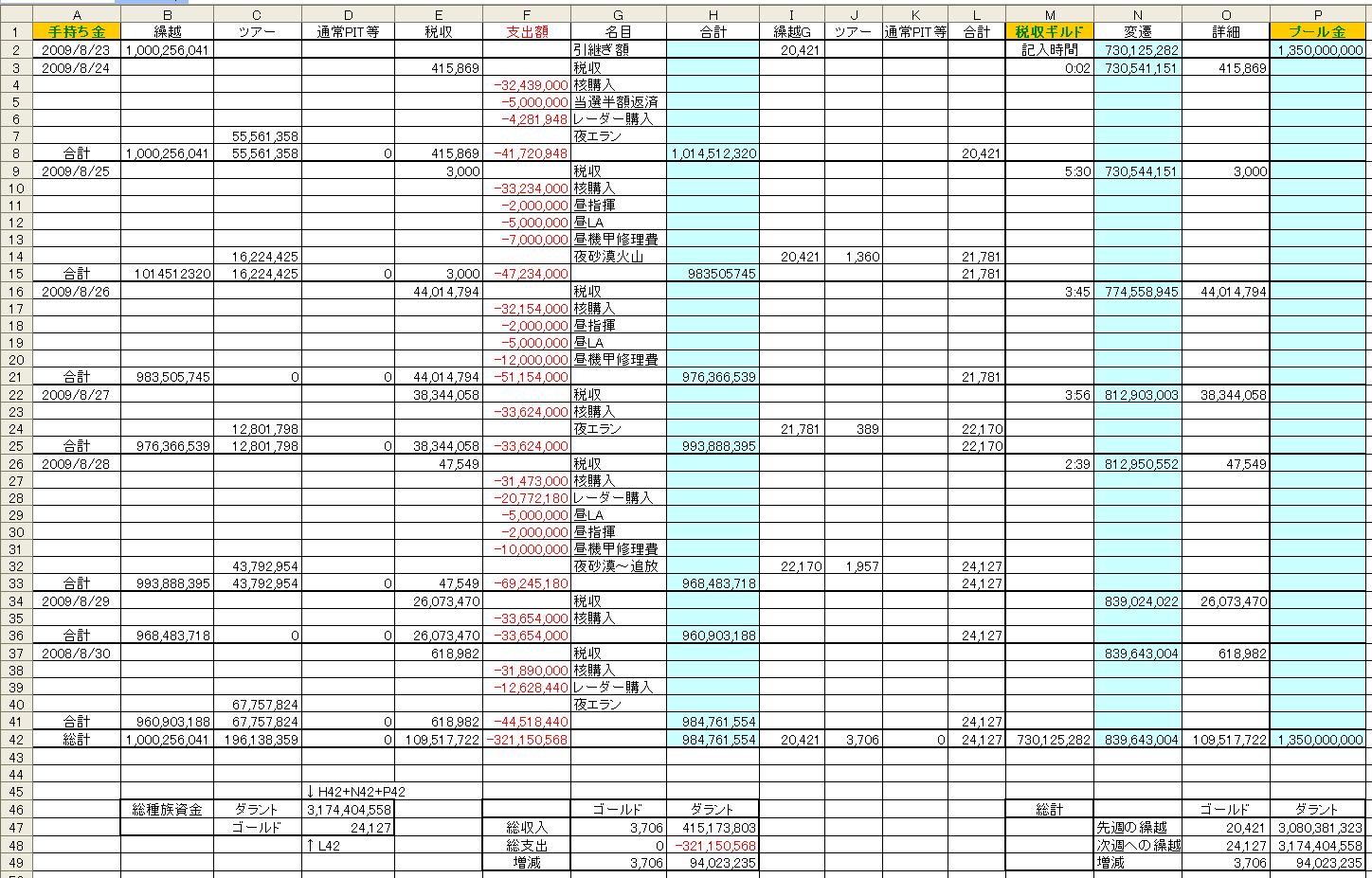 × [PR]上記の広告は3ヶ月以上新規記事投稿のないブログに表示されています。新しい記事を書く事で広告が消えます。 ↑クリックで詳細が別窓表示されます。(2009/8/31~9/6) ↑クリックで詳細が別窓表示されます。(2009/9/7~9/13) ↑クリックで詳細が別窓表示されます。(2009/9/14~9/20) ↑クリックで詳細が別窓表示されます。(2009/9/21~9/27) 2009年8月31日~9月27日 総収入 1,221,006,579D、 11,714G 総支出 1,795,308,566D、 26,667G 差し引き 574,301,987D、 14,953Gの赤字でした。 総種族資金は2,600,102,571D、 9,174Gです。 経験値3倍イベント期間中、過去BDキー無料配布イベントを行ないました。 147個の過去BDキーを配布することができ、キー代金として594,188,010Dを種族資金から引き出しました。 PR ↑クリックで詳細が別窓表示されます。 2009年8月17日~8月23日 収入388,605,215D、 3,972G 支出327,027,232D 差し引き61,577,983Dの黒字でした。 総種族資金は3,080,381,323D、 20,421Gです。 レーダー持ってない人をゼロにしたいと考えています。 配布量大増加検討中です。 2009年8月17日より、オークション集計時、種族資金用の1人分を種族資金へ入れる、いわゆる「種族金君」制度を廃止しました。 黒字経営体質になってきたので、廃止しても種族資金運営できると判断しました。 これにより、微量ですが、一般配当金額が上昇します。 昼聖戦の報酬を、昔のように、朝昼夜一律同じに戻しました。 今後のTベラの状況を見ながら、その時代に合った内容に、随時変えていきたいと思います。 ※『聖戦勝利報酬』 【朝聖戦】 LA:5mD 指揮:2mD 機甲修理費:上限1mD 【昼聖戦】 LA:5mD 指揮:2mD 機甲修理費:上限1mD 【夜聖戦】 LA:5mD 指揮:2mD 機甲修理費:上限1mD ↑クリックで詳細が別窓表示されます。 2009年8月10日~8月16日 収入380,575,002D、 4,327G 支出279,520,672D 差し引き101,054,330Dの黒字でした。 総種族資金は3,018,803,340D、 16,449Gです。 しばらくの間、代行で、久しぶりに種族長をさせて頂くこととなりました。 総種族資金は、3G台となり、約2ヵ月半分の備蓄となっています。 みんなに還元するべく、レーダー配布数の強化を検討しているため、今後の支出は増加傾向になる予定です。 ツアー集計時の「種族金君」なのですが、撤廃を検討中です。 皆さんお誘いの上、一緒に聖戦出ましょう。 一人でも多くの参加者が増えることを待望します。 ↑クリックで詳細が別窓表示されます。 2008年11月10日~11月16日 収入226,624,930D、 16,099G 支出313,692,340D 9期目は87,067,410Dの赤字でした。 総種族資金は1,085,983,960D、 32,465Gです。 この週から再び種族長をさせて頂ける事となりました。 リアル仕事の都合により、聖戦時核撃てる可能数が少ないのは相変わらず変わっていません。 しばらく立候補を続けてみて、みなさんの総意を仰ぎながら、継続すべきか種族長(ボマー)を他の人に変わったほうがいいのか、様子をみていこうと思います。 朝昼晩全ての聖戦で、RF世界観のコンセプトである「三つ巴」が実現するよう、しばらく活動を続けていきたいと考えています。 一種族を超えて、皆様どうかよろしくお願い致します。 ↑クリックで詳細が別窓表示されます。 任期6期目は約118mの赤字でした。 1期~6期の6週間をトータルで見たら、約400mの黒字となっているように見えます。 しかし、引退オークや寄付などの突然収入を抜いて自己経営力のみでみると、6週間で約37mの黒字でしかありません。 相変わらず厳しい状態が続いています。 その背景として、「核をどんどん撃ってほしい」との要望を、各種ギルドや個人の方まで、多数の方から伺っており、現在核MAX購入(1日3発、1週間21発購入)を続けております。 幸い、ベラートの勝利数増加のお陰で、なんとか保っている状態です。 支出は、「聖戦関連」、「レーダー購入」、「当選者半額返還」の3つしかありません。 「レーダー購入」と「当選者半額返還」は、多少の増減あれども、ほぼ固定費として変動しません。 削るとしたら「聖戦関連」の中の、「核購入代金」と「各種報酬金」しかないです。 コラは、LA報酬や指揮報酬ないという情報を聞いたのですが、ベラの場合どうでしょうねぇ~。 7勝しても118m赤字は正直厳しいので、核保有弾数上限を設定して微調整をする予定です。 9月1日(月)朝の段階では、総保有数16発。 15発を下回ったら購入し、弾数維持予定です。 ちなみに、1週間にかかる核21発分の購入費用は、228mの支出となります。 寄付を頂いたとしても、一瞬で消えてしまう金額です。 残された可能な対策は「収入を増やす」しかありません。 さてさて、何をしましょうかねぇ。 |