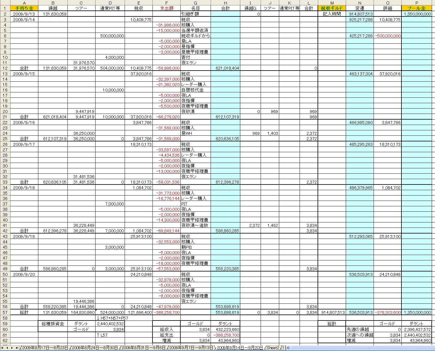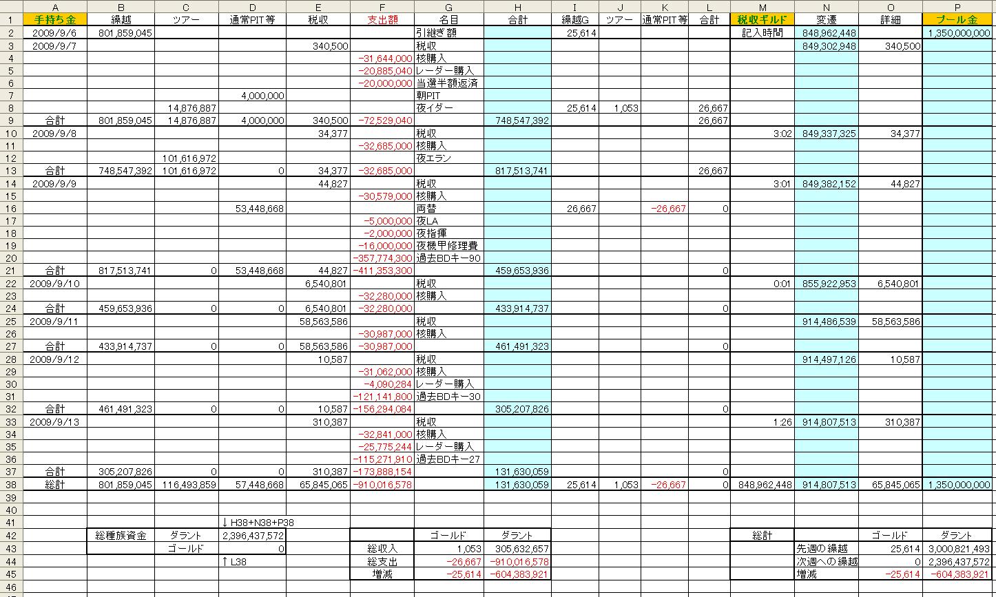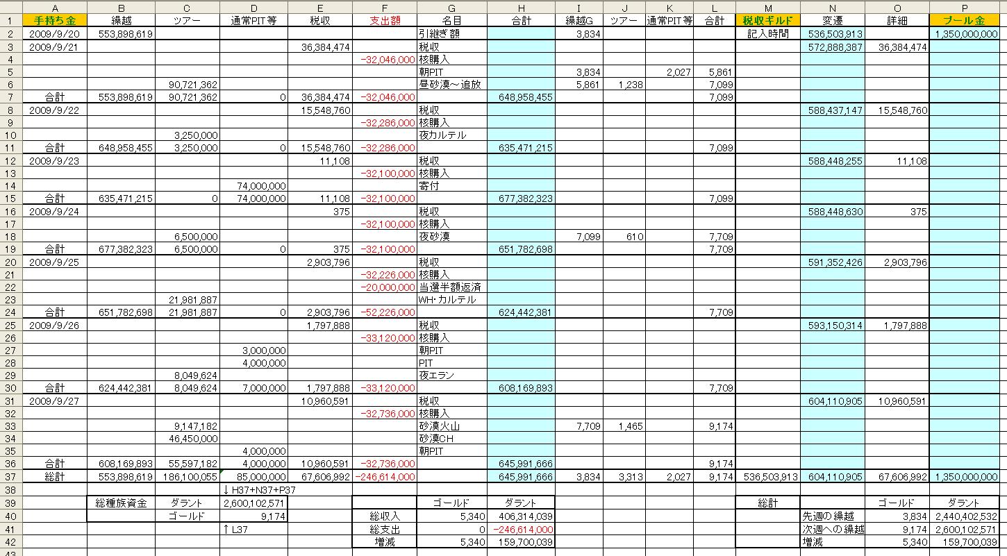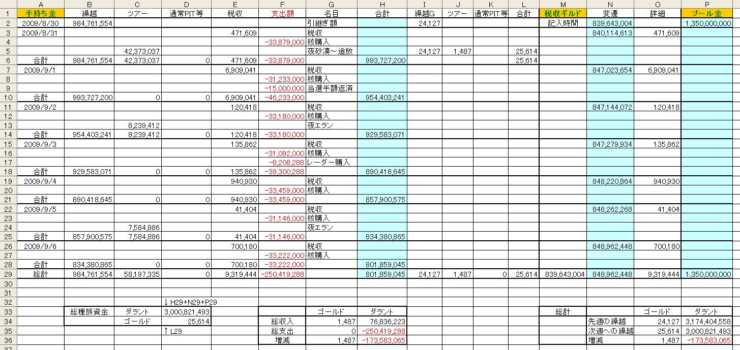 × [PR]上記の広告は3ヶ月以上新規記事投稿のないブログに表示されています。新しい記事を書く事で広告が消えます。 ↑クリックで詳細が別窓表示されます。(2009/8/31~9/6) ↑クリックで詳細が別窓表示されます。(2009/9/7~9/13) ↑クリックで詳細が別窓表示されます。(2009/9/14~9/20) ↑クリックで詳細が別窓表示されます。(2009/9/21~9/27) 2009年8月31日~9月27日 総収入 1,221,006,579D、 11,714G 総支出 1,795,308,566D、 26,667G 差し引き 574,301,987D、 14,953Gの赤字でした。 総種族資金は2,600,102,571D、 9,174Gです。 経験値3倍イベント期間中、過去BDキー無料配布イベントを行ないました。 147個の過去BDキーを配布することができ、キー代金として594,188,010Dを種族資金から引き出しました。 PR